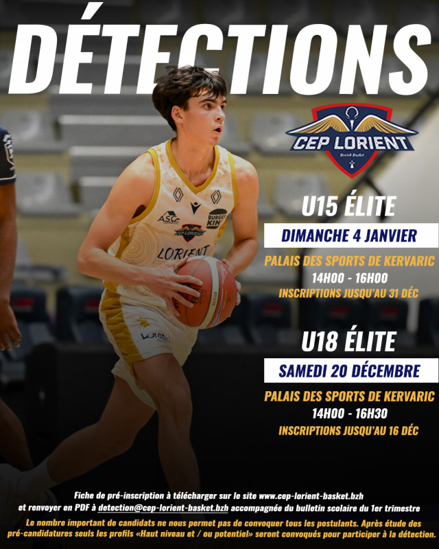 Télécharger la fiche de pré candidature sur notre site internet (https://www.cep-lorient-basket.bzh/detection-u15-elite-u18-elite)et la retourner accompagnée du bulletin scolaire du 1er trimestre à 𝗱𝗲𝘁𝗲𝗰𝘁𝗶𝗼𝗻@𝗰𝗲𝗽-𝗹𝗼𝗿𝗶𝗲𝗻𝘁-𝗯𝗮𝘀𝗸𝗲𝘁.𝗯𝘇𝗵